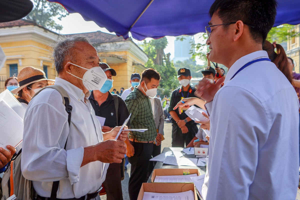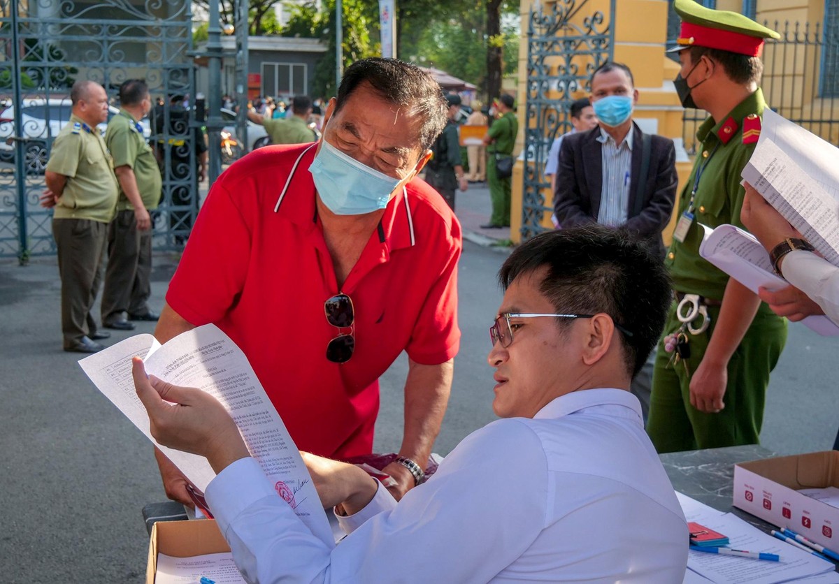 Ông Vĩ (bìa trái) có mặt từ sáng sớm để được dự phiên tòa